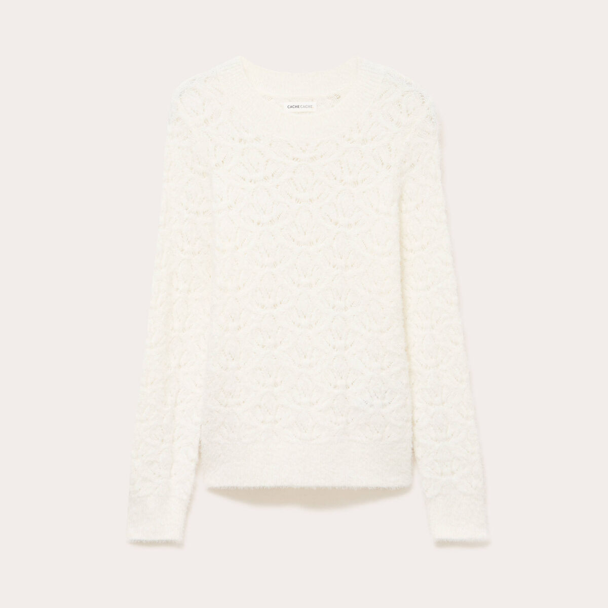 Pull ajouré col rond manches longues ecru femme