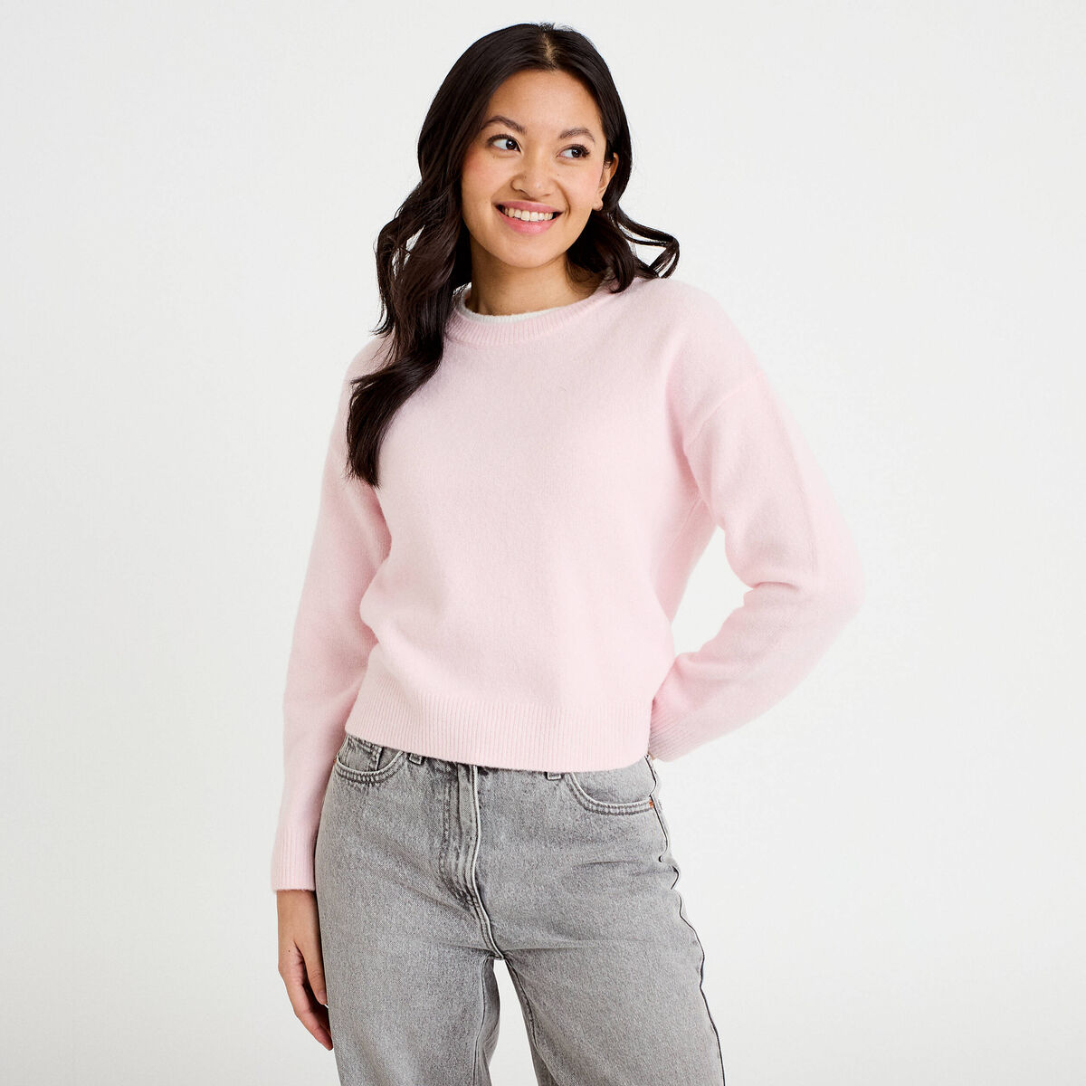 Pull col rond manches longues rose clair femme