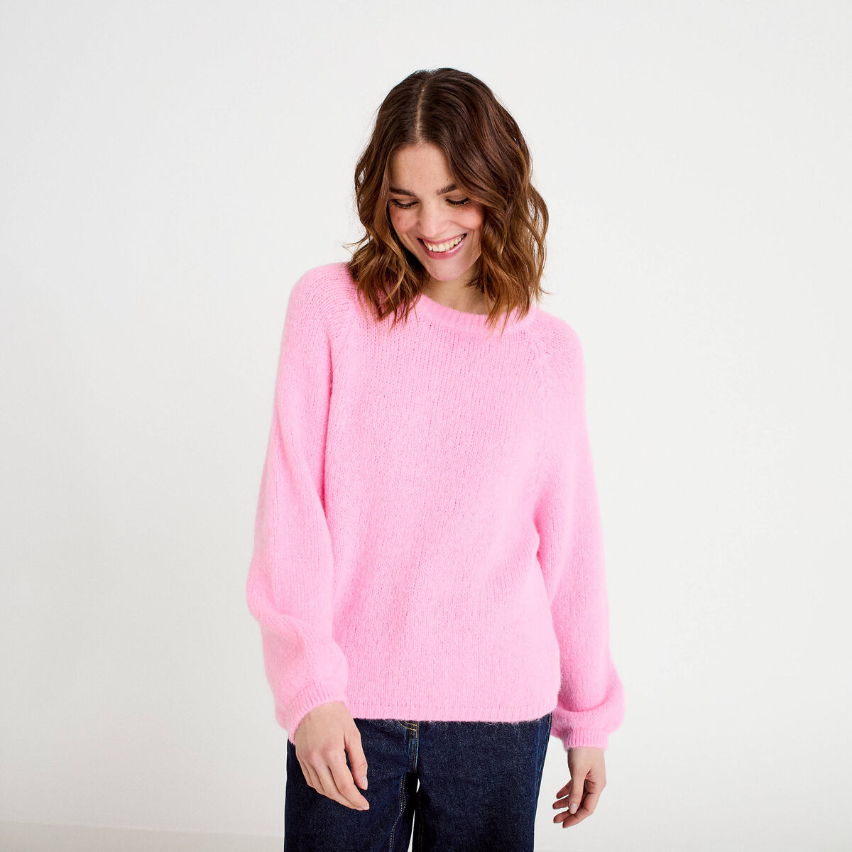 Pull ample col rond manches longues rose femme