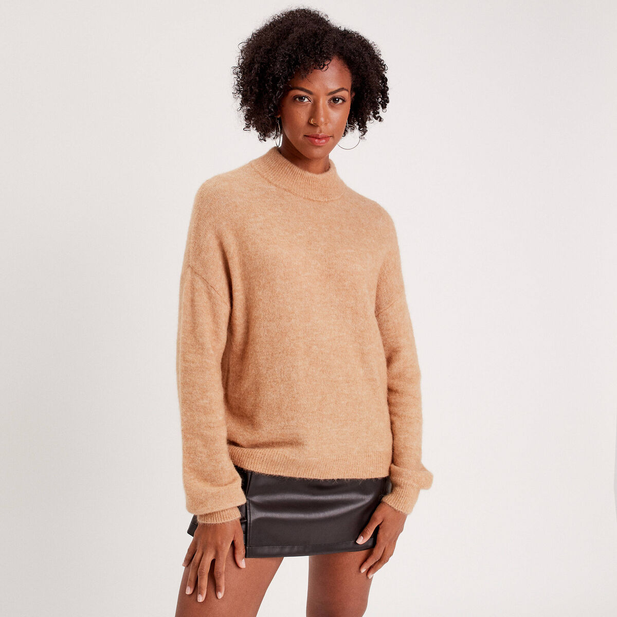 Pull col montant marron cognac femme