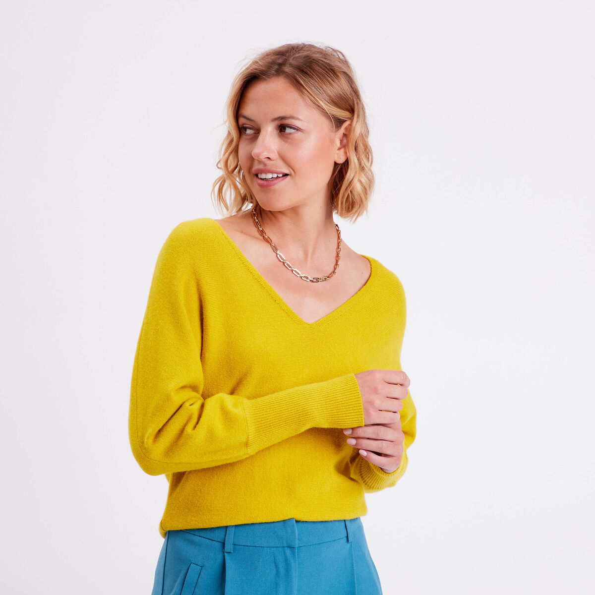 Pull col en V avec boutons vert anis femme
