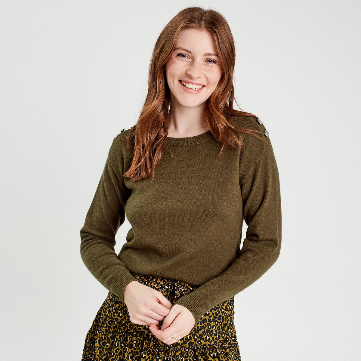 Pull avec boutons épaules vert kaki femme