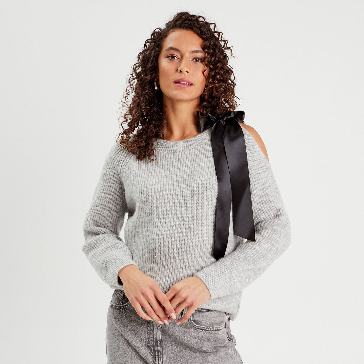 Pull avec noeud gris clair femme