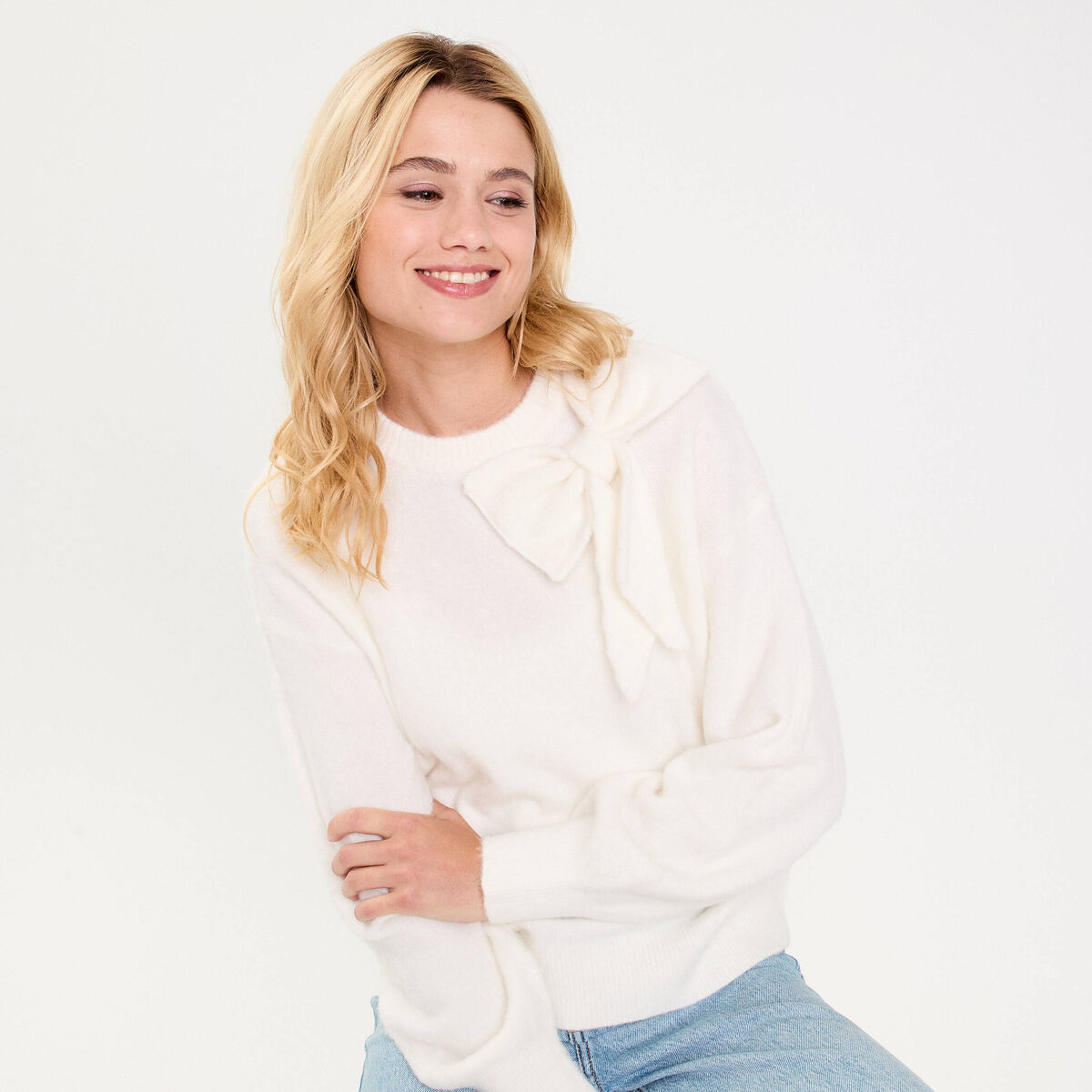 Pull oversize col avec noeud ecru femme
