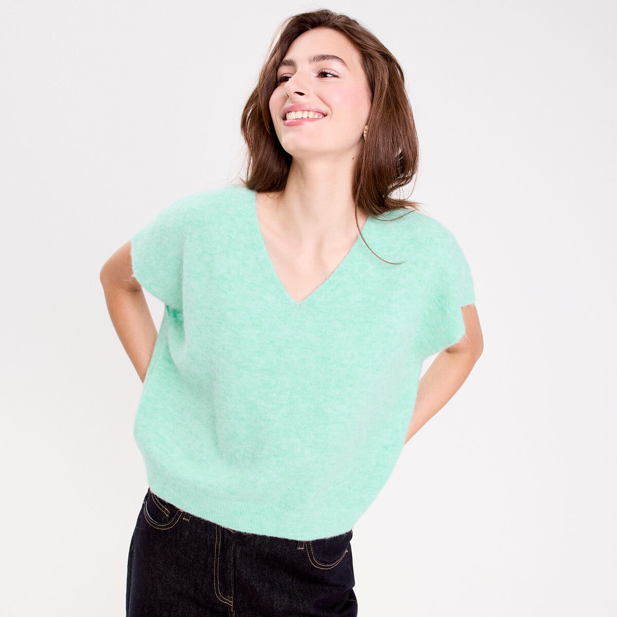 Pull oversize court manches courtes vert menthe femme