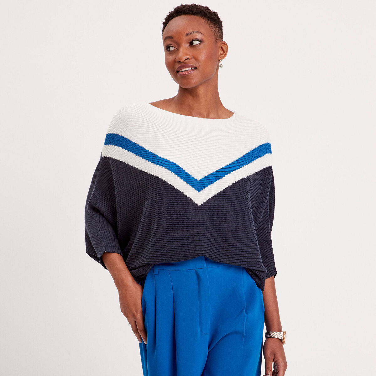 Pull manches 3/4 chauve-souris bleu marine femme