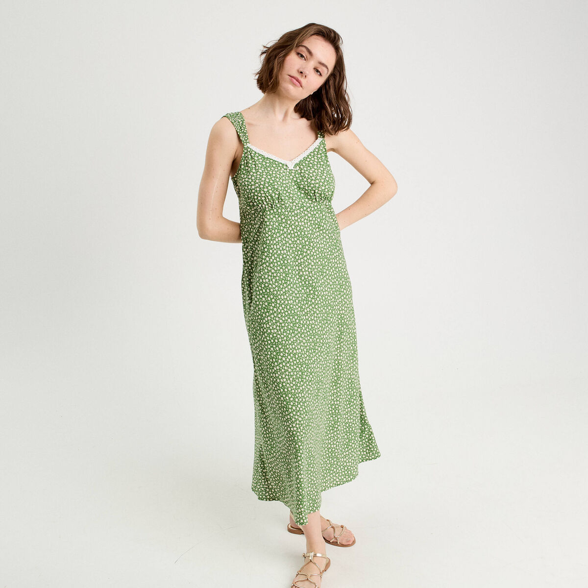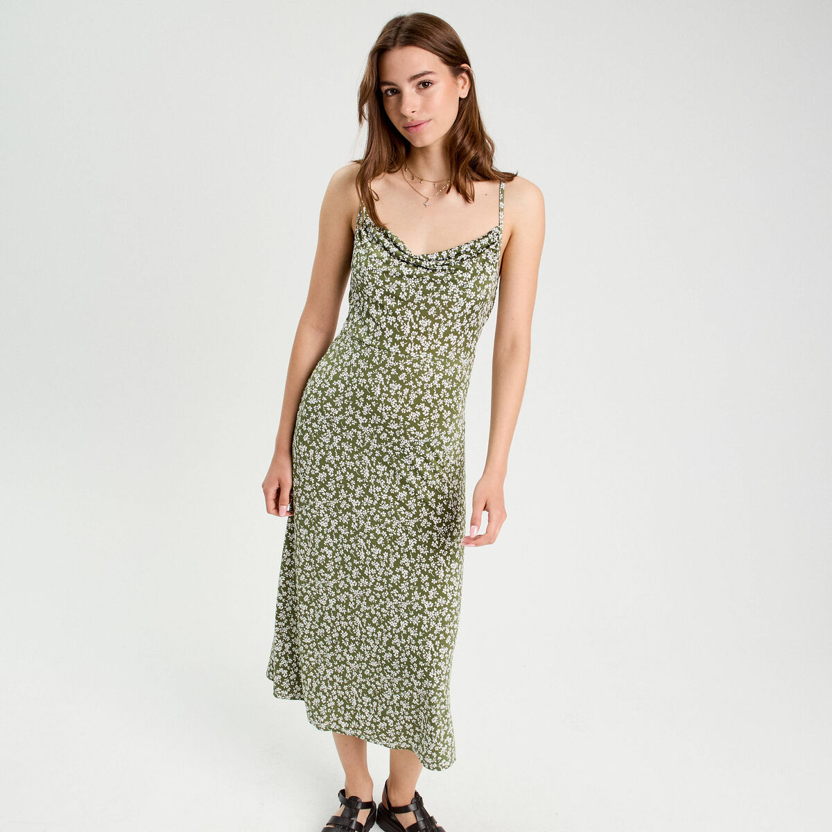 Robe longue évasée vert kaki femme