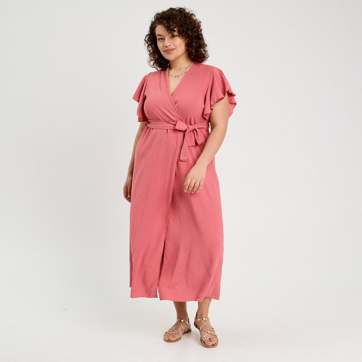 Robe longue évasée cache-coeur vieux rose femme