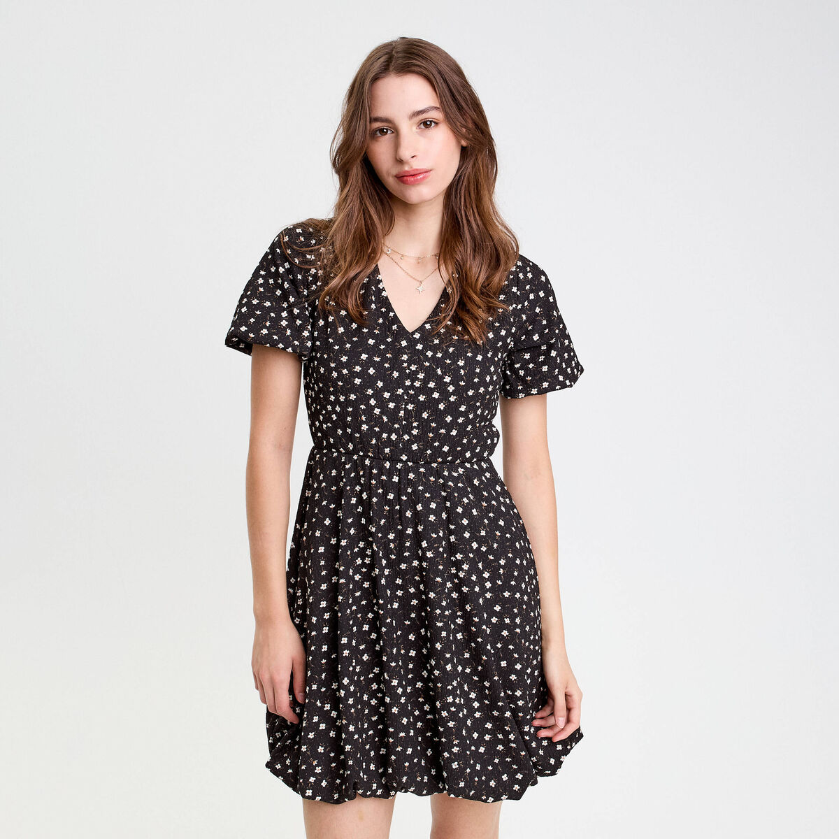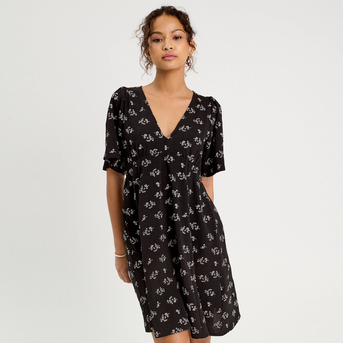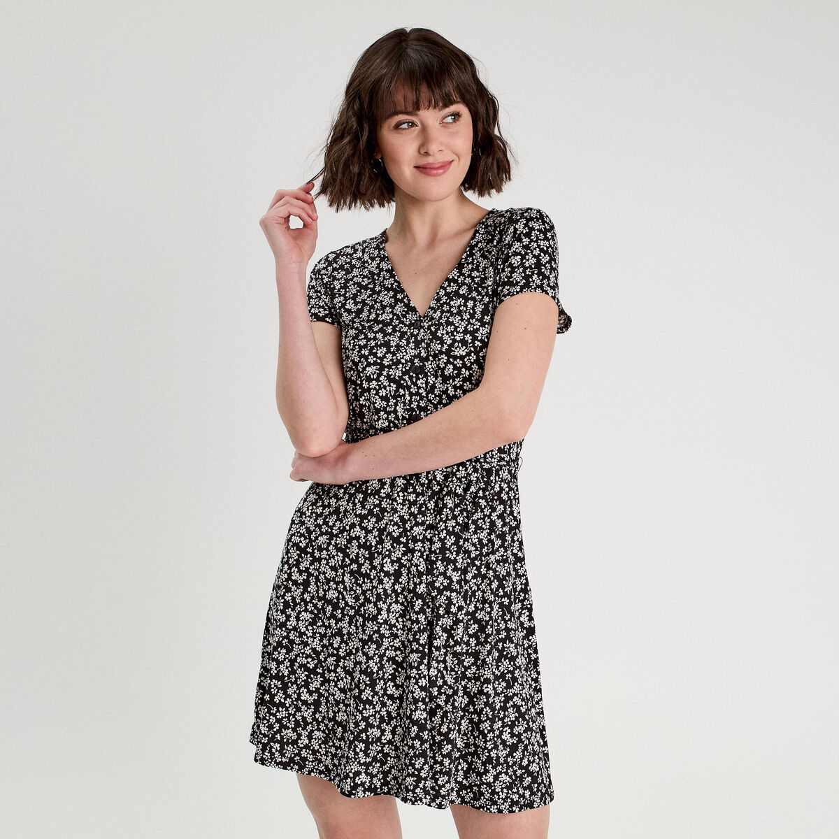 Robe courte évasée col v manches courtes noir femme