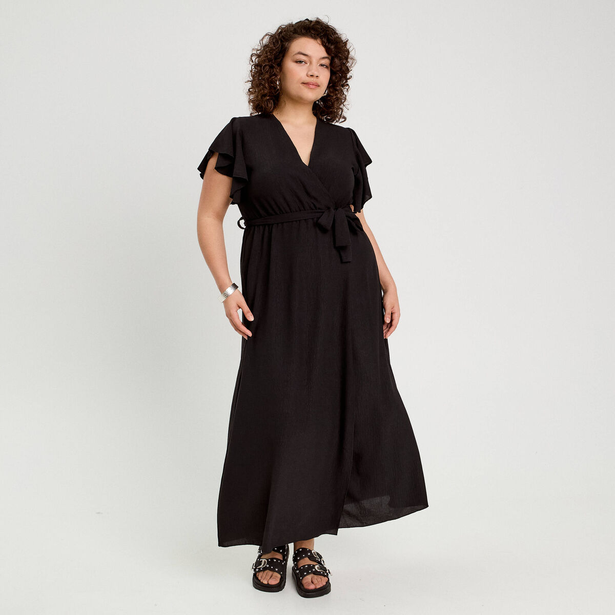 Robe longue évasée cache-coeur noir femme