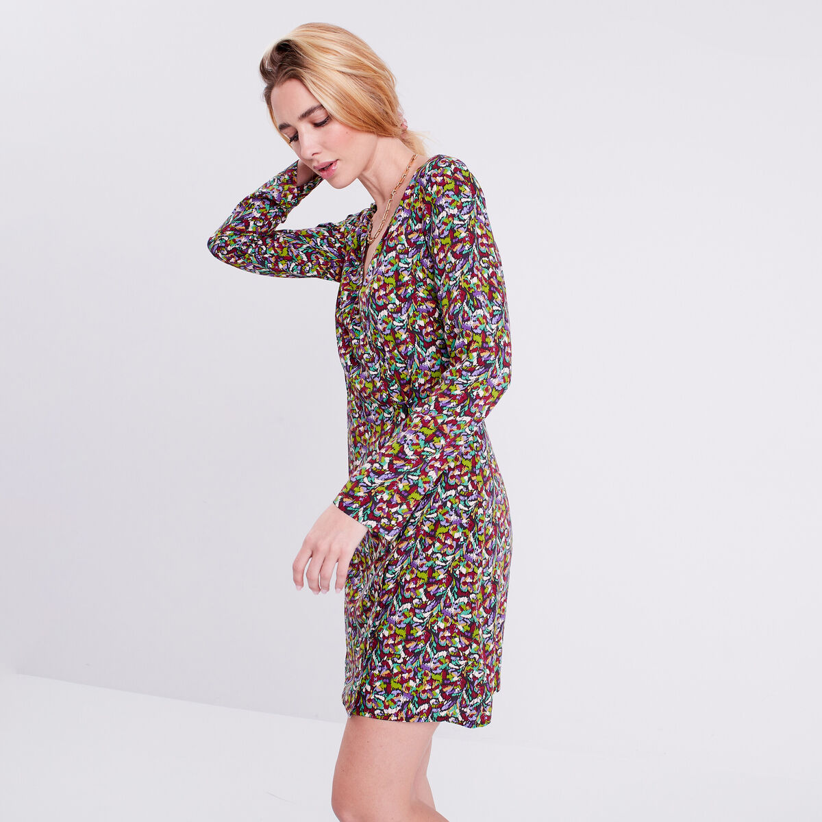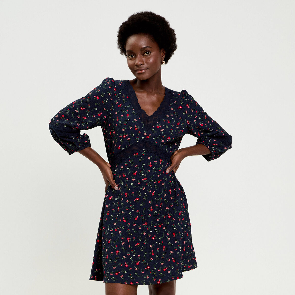 Robe évasée col v manches longues bleu marine femme
