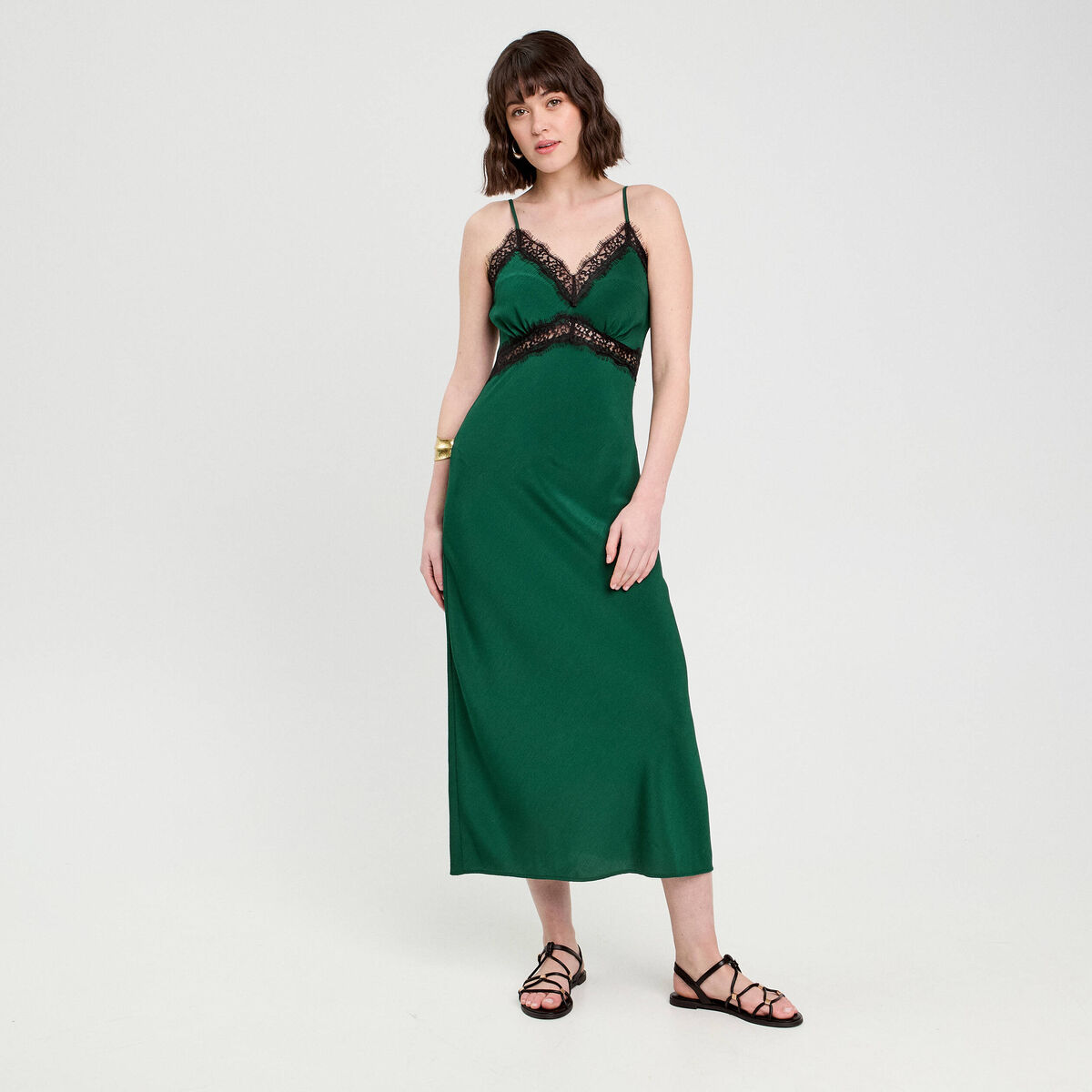 Robe longue ajustée dentelle vert foncé femme