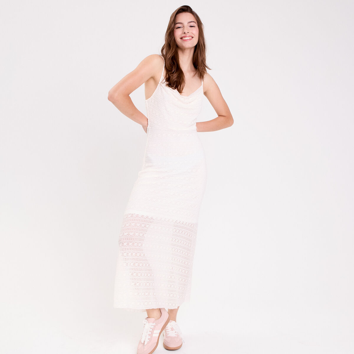 Robe longue évasée ajourée ecru femme