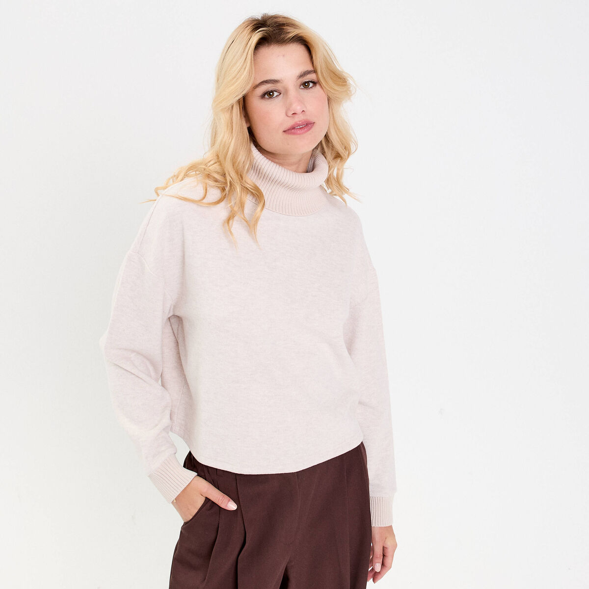 Sweat col roulé manches longues sable femme