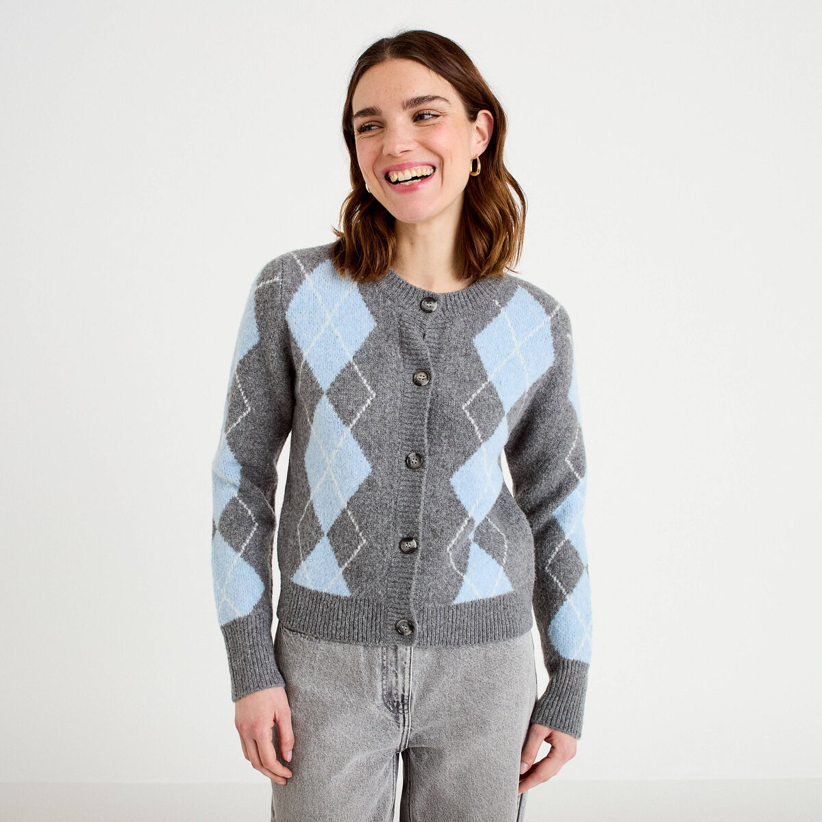 Cardigan col rond manches longues gris foncé femme
