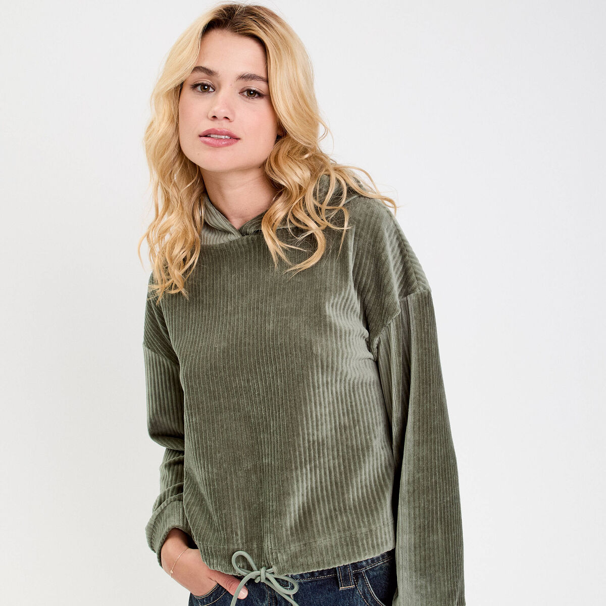 Sweat oversize velours col rond vert kaki femme