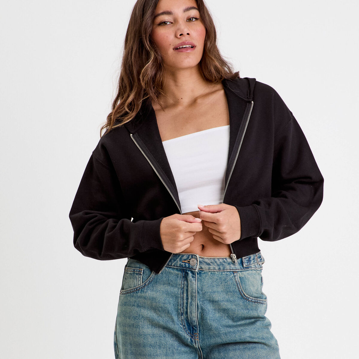 Sweat zippé à capuche noir femme