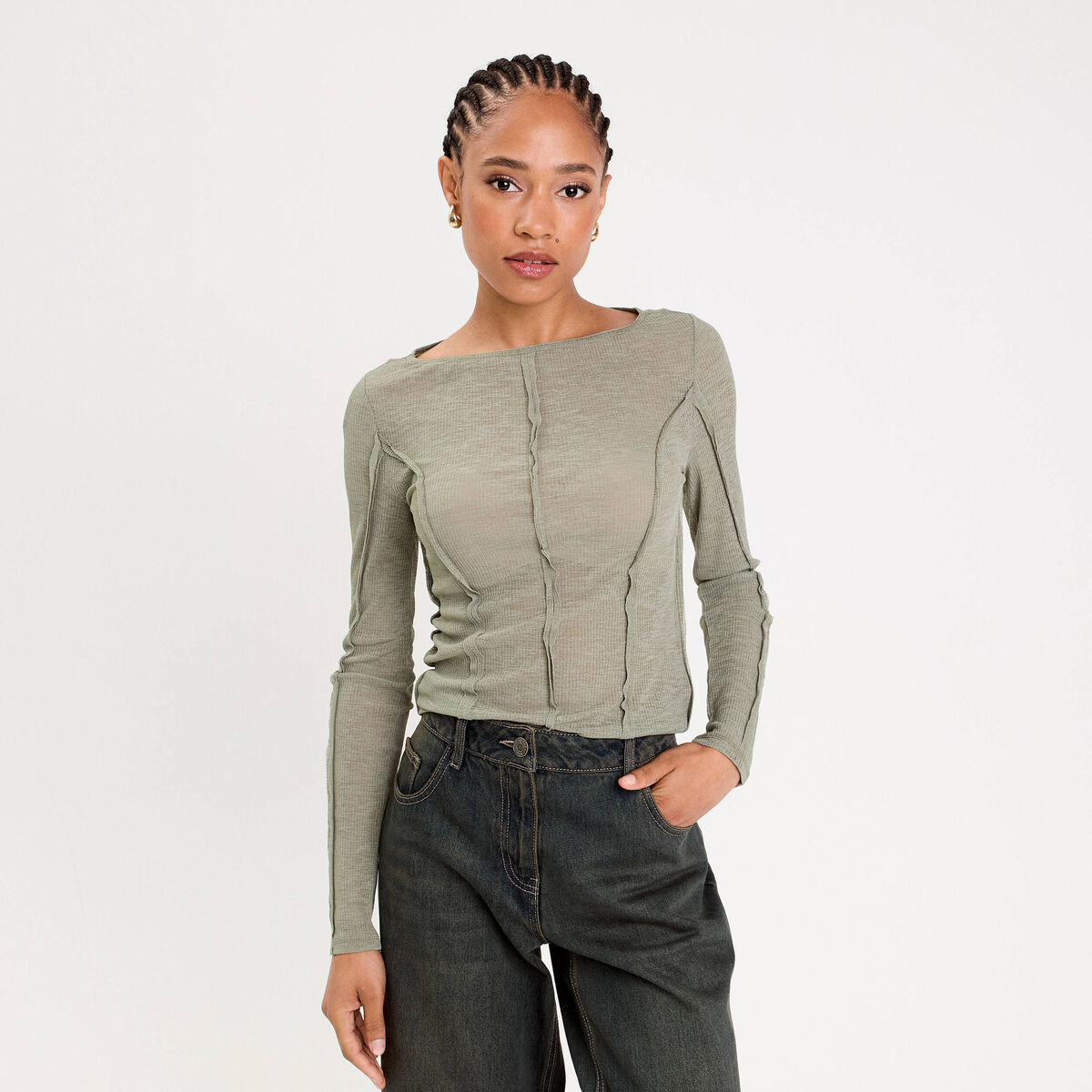 T-shirt cintré col rond manches longues vert kaki femme