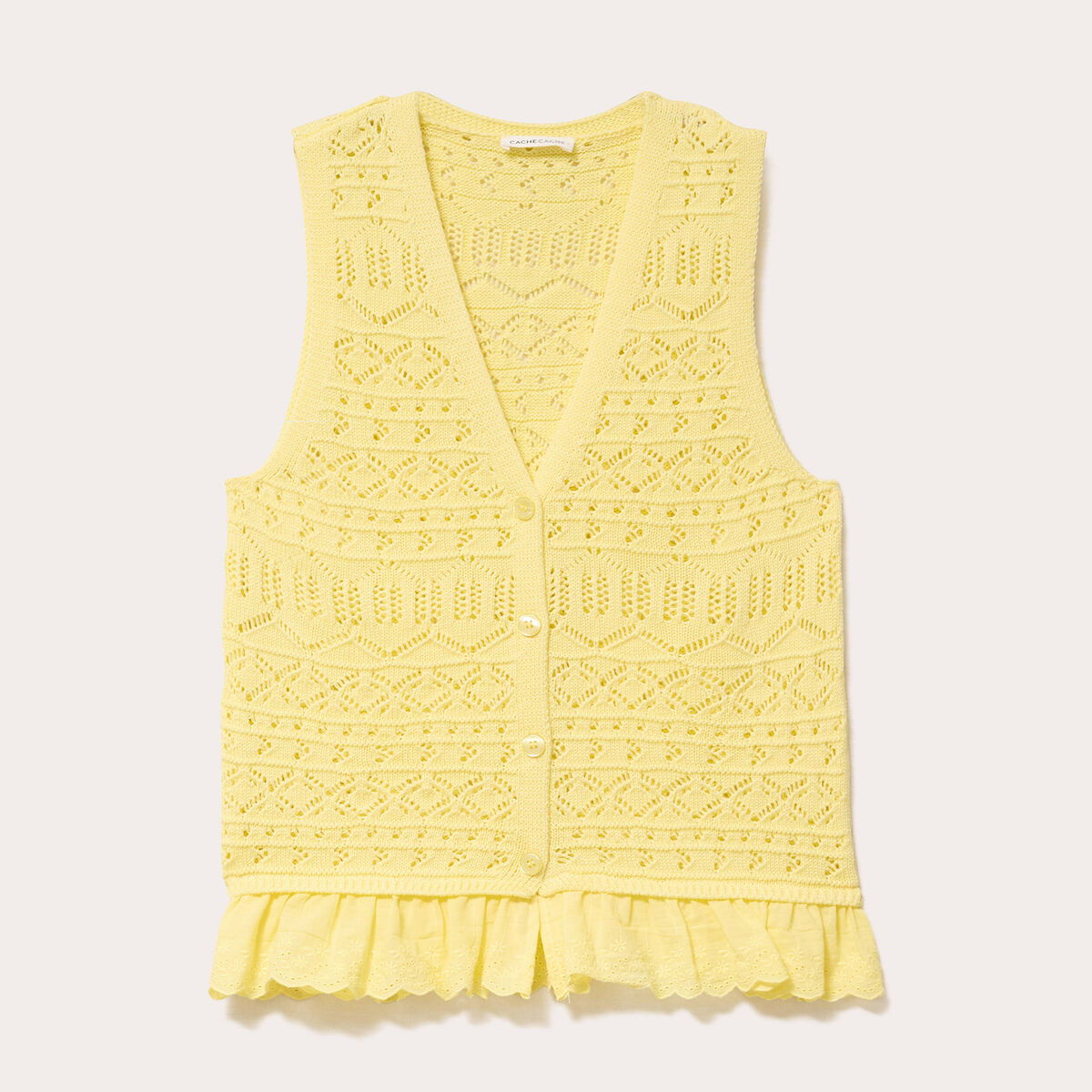 Débardeur col v ajouré aspect dentelle jaune clair femme