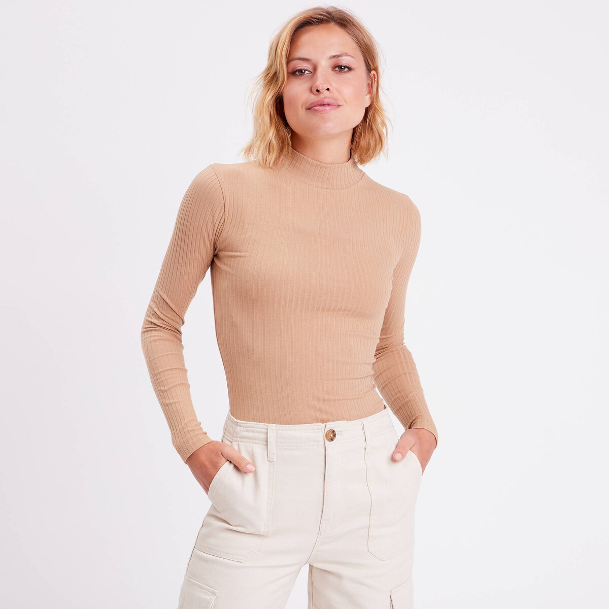 T-shirt côtelé col montant marron clair femme