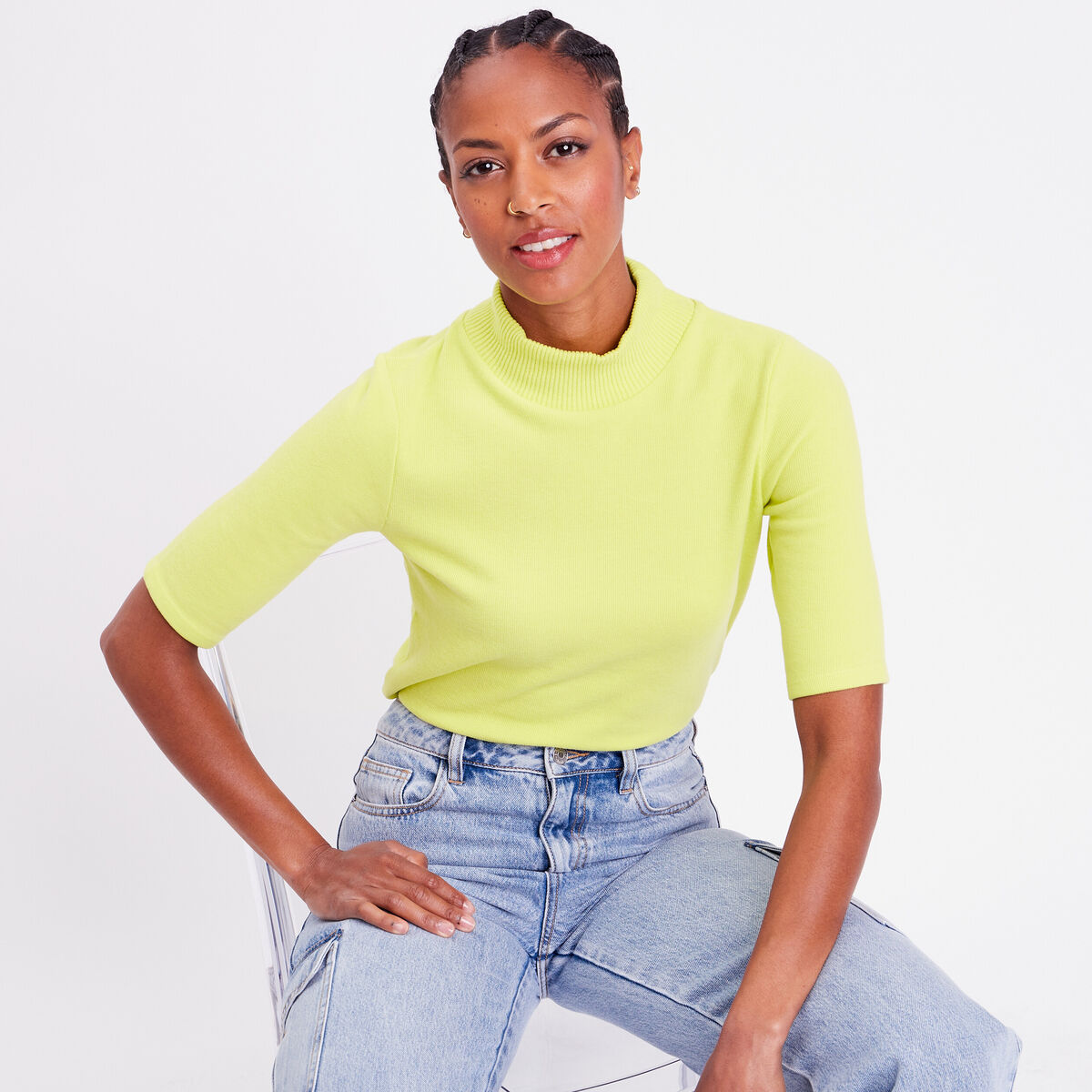 T-shirt côtelé col montant jaune citron femme