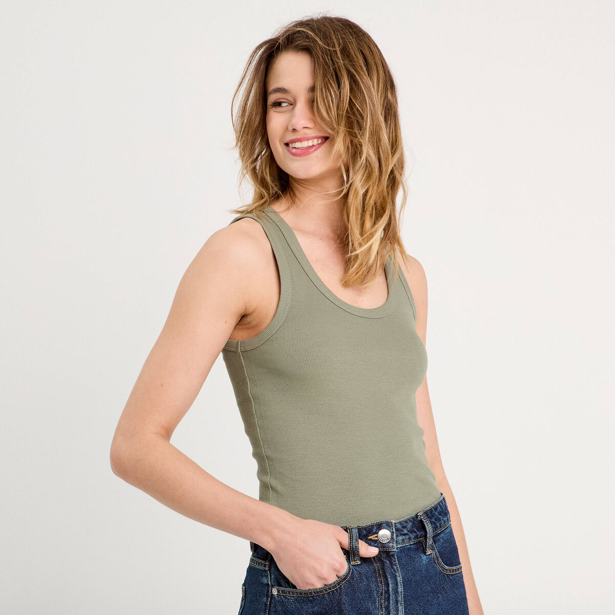 Débardeur côtelé col rond vert kaki femme