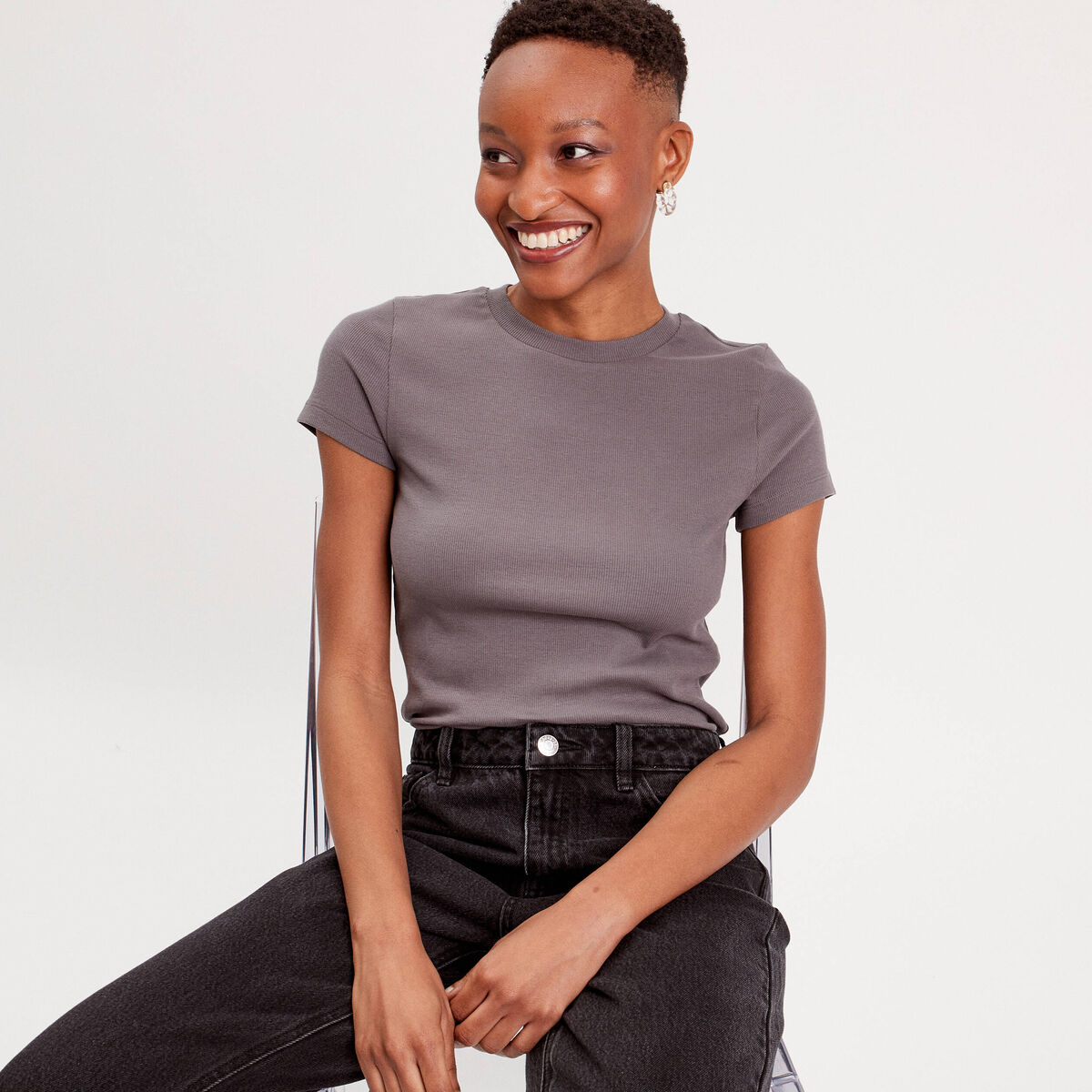 T-shirt manches courtes côtelé gris foncé femme