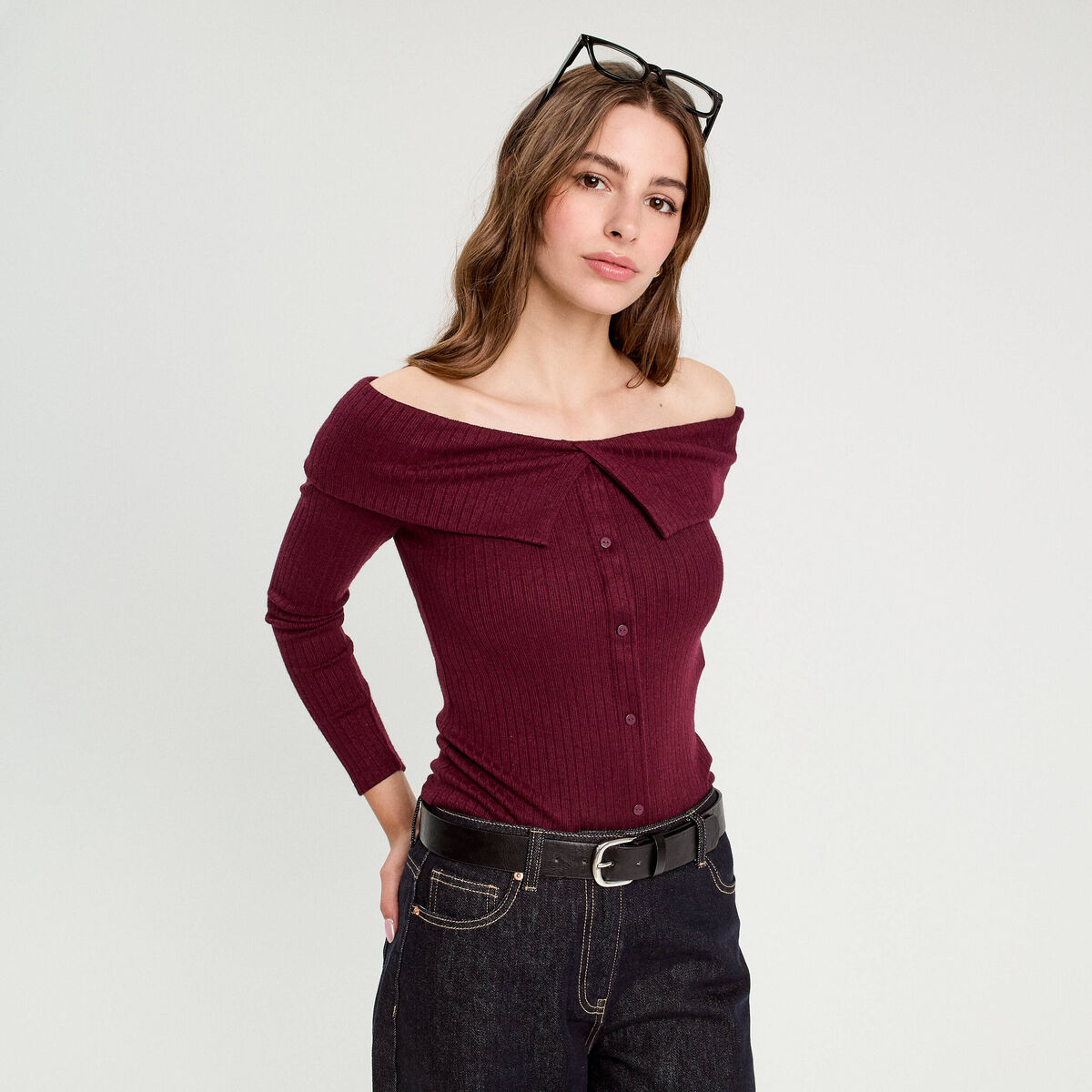T-shirt côtelé col bardot violet foncé femme