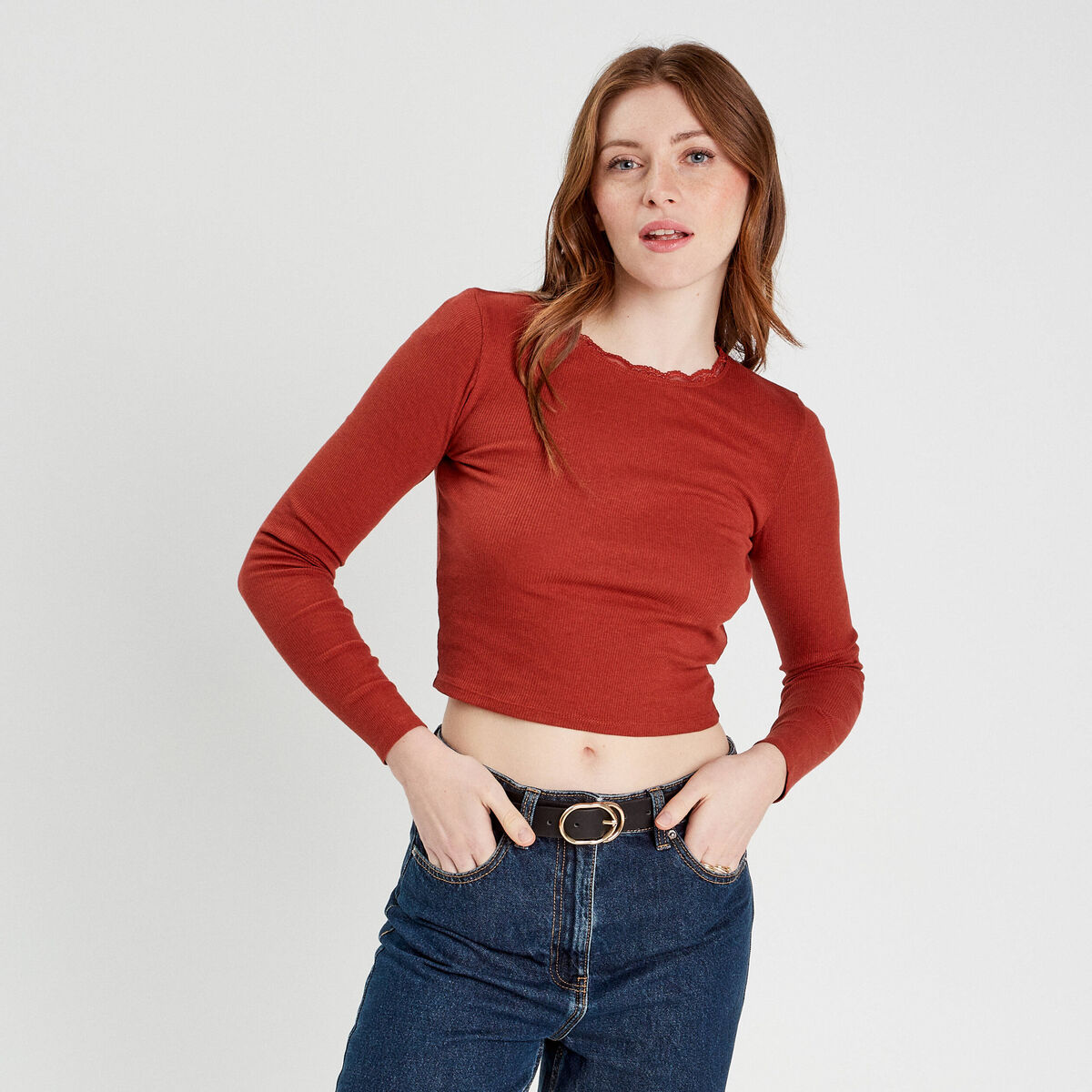 T-shirt cropped côtelé marron femme