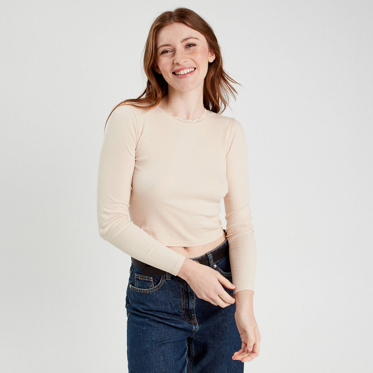 T-shirt cropped côtelé ecru femme