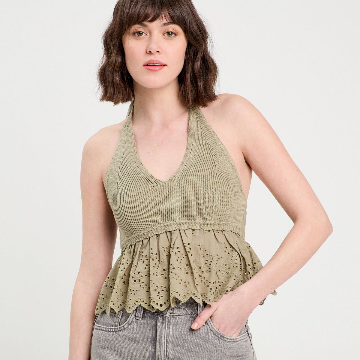 Crop top tricot avec broderie vert kaki femme