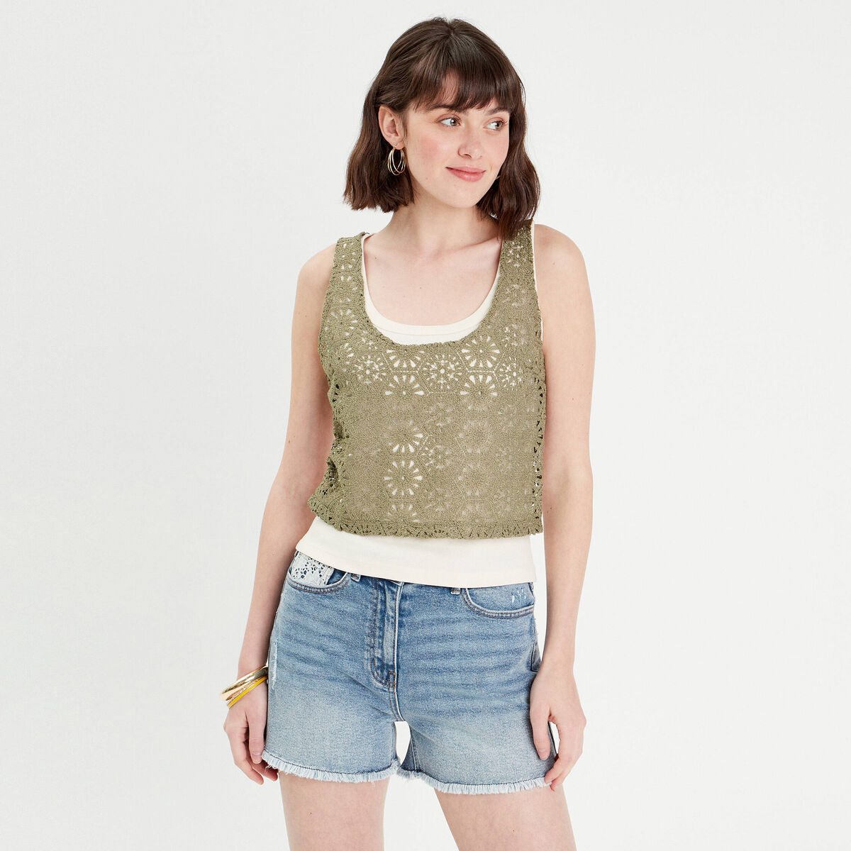 Débardeur 2-en-1 crochet vert kaki femme