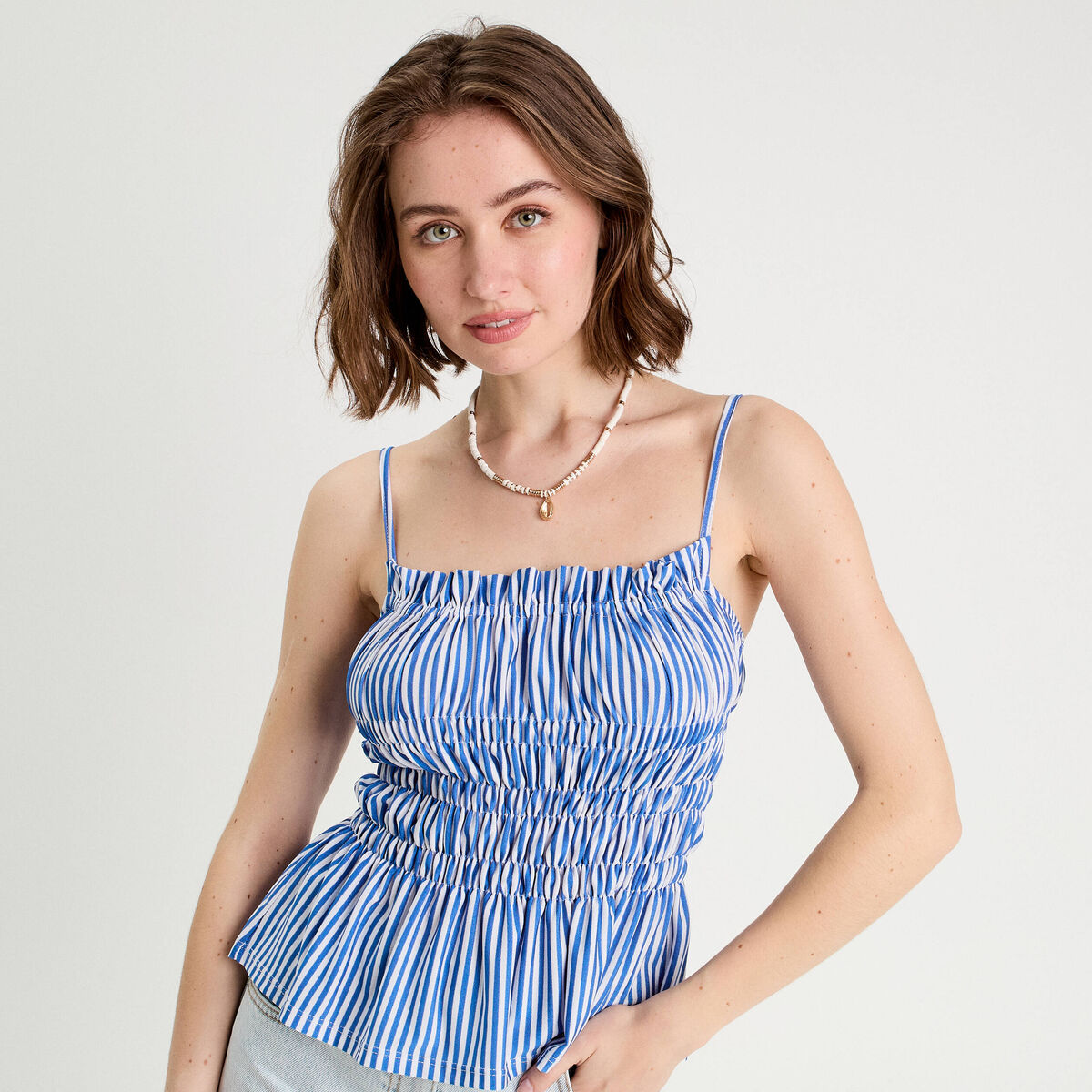 Débardeur smocké bretelles fines bleu clair femme