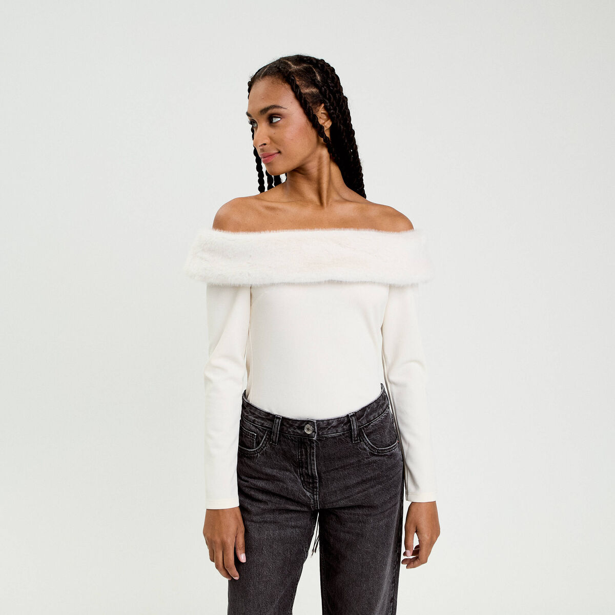 T-shirt col bardot fausse fourrure ecru femme