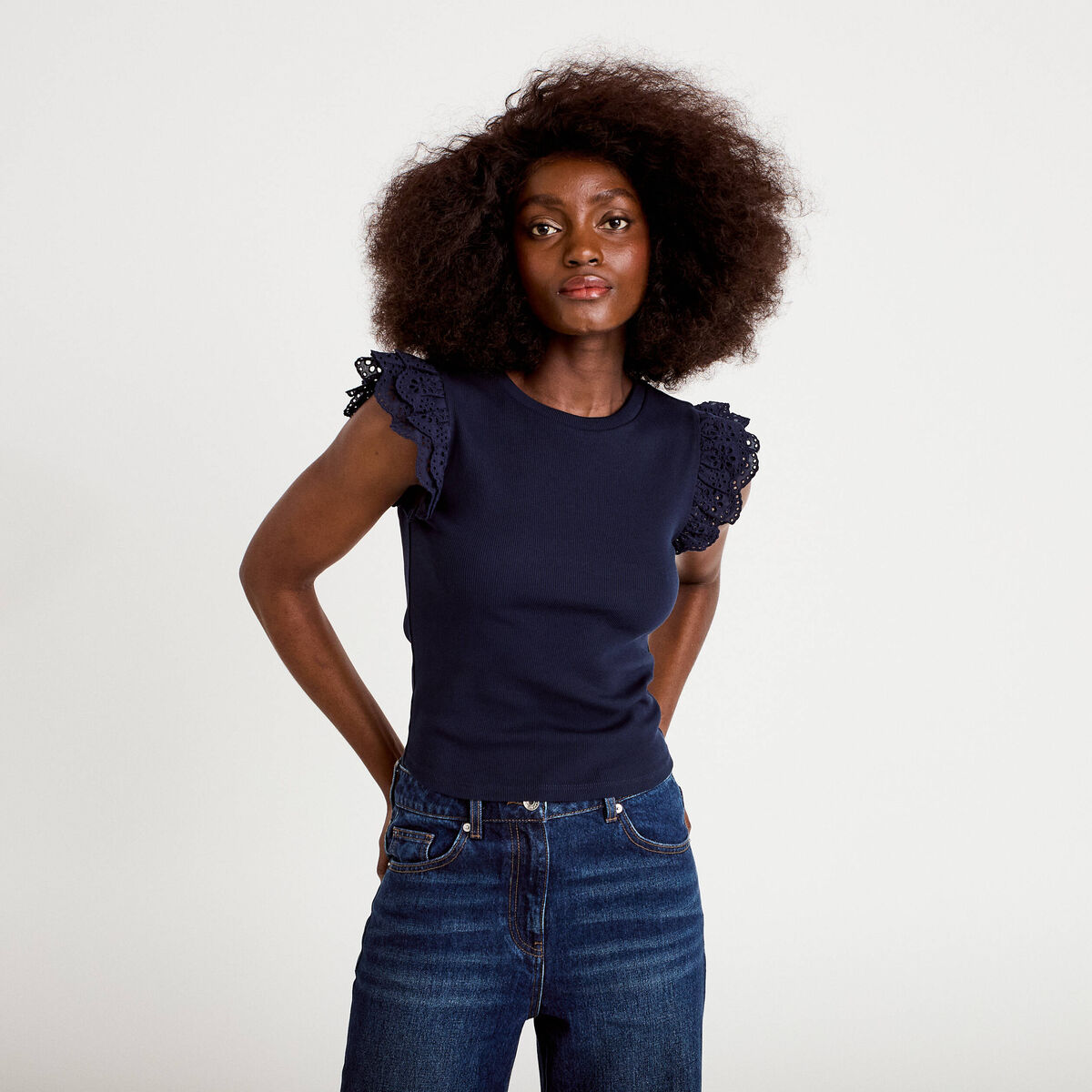 Débardeur volants brodés bleu marine femme
