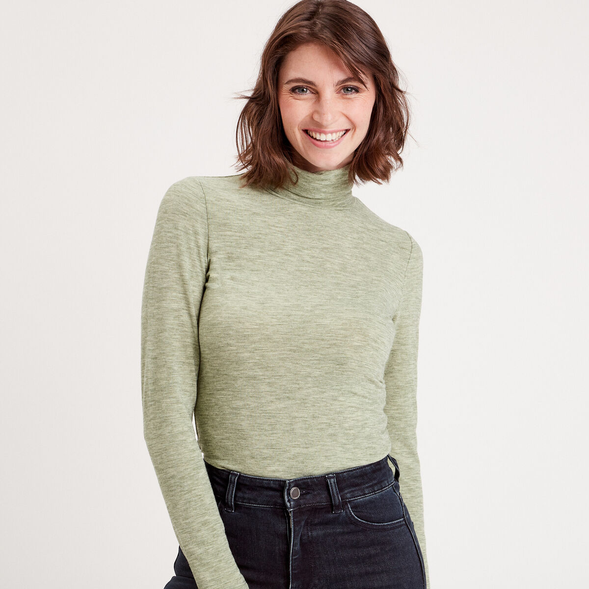 T-shirt col roulé vert kaki femme