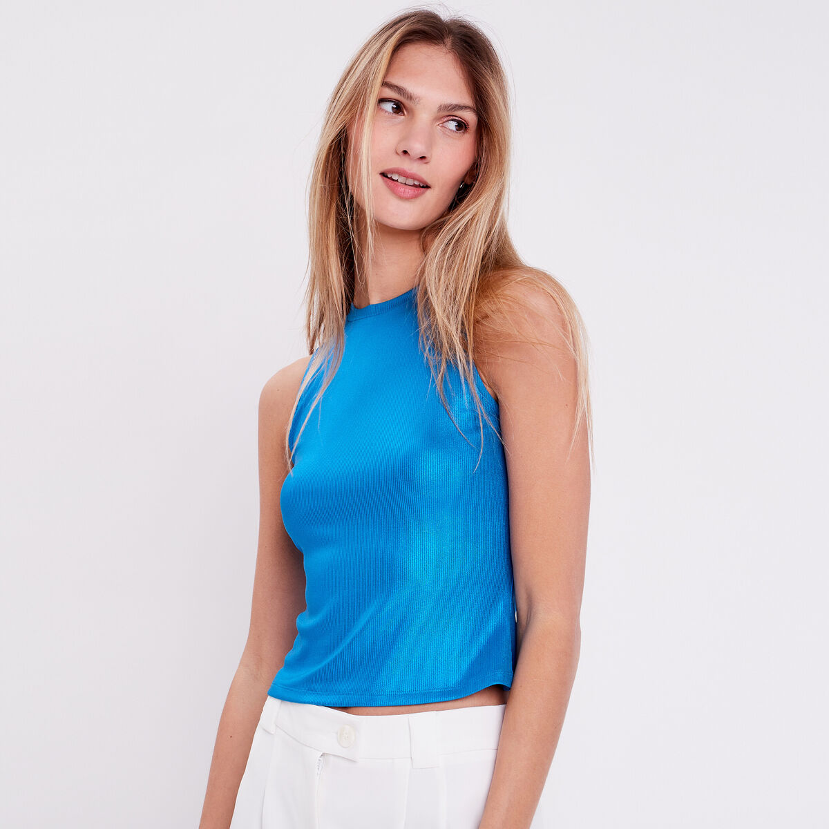 Débardeur cropped côtelé bleu femme