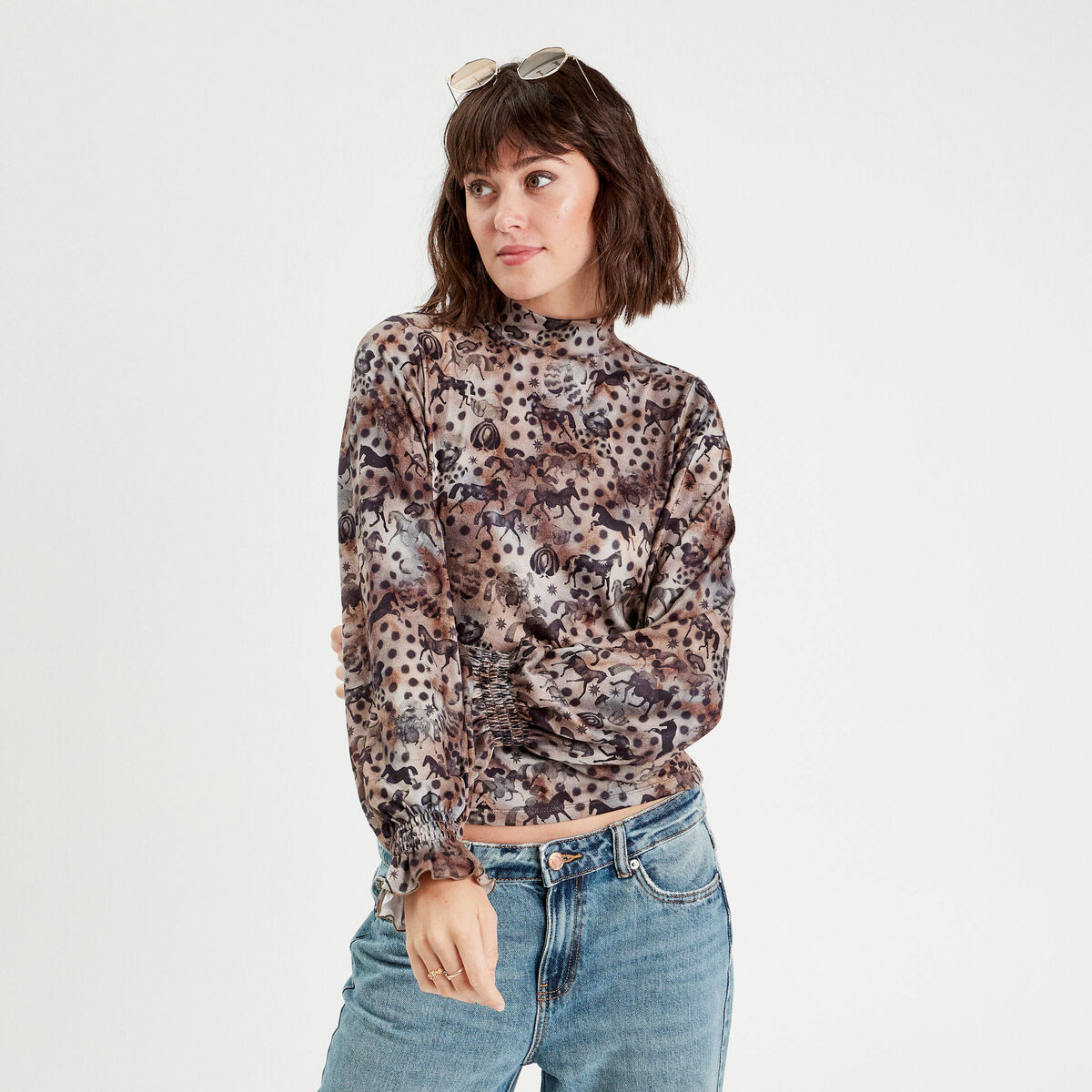 T-shirt col montant marron femme