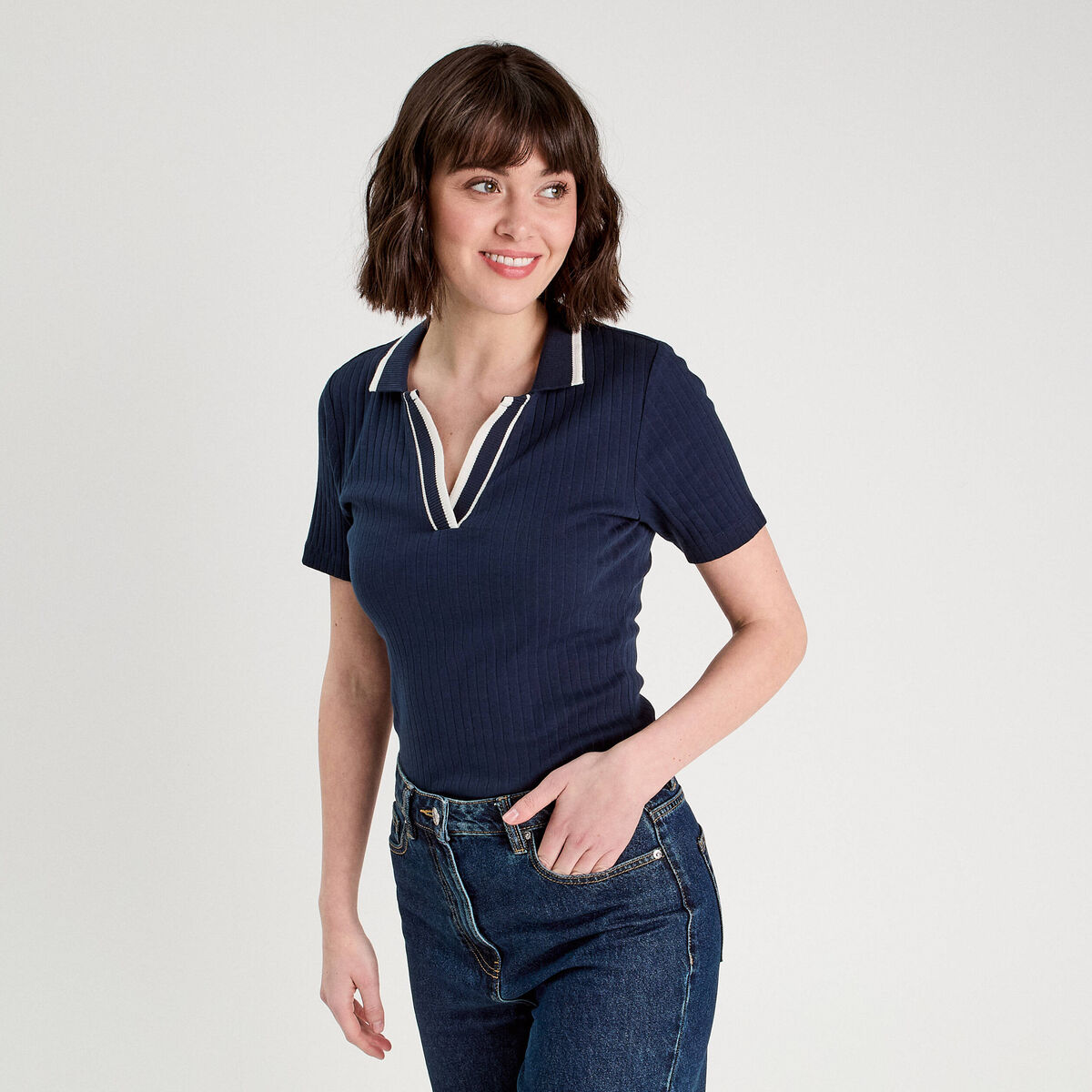 Polo côtelé manches courtes bleu marine femme