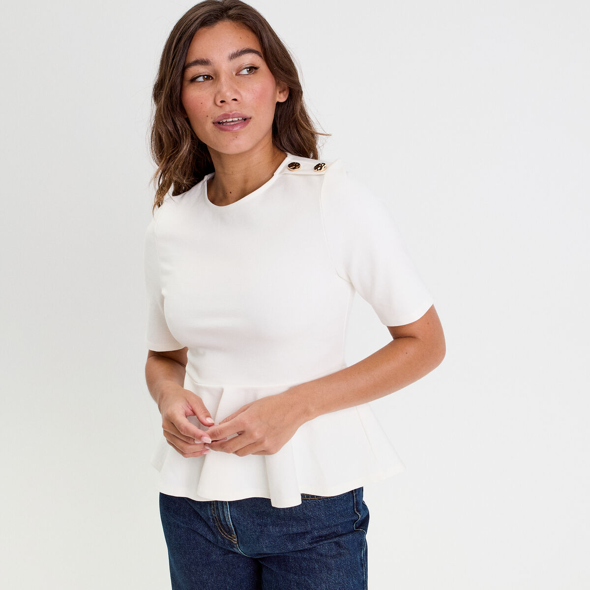 Top cintré col rond manches longues ecru femme