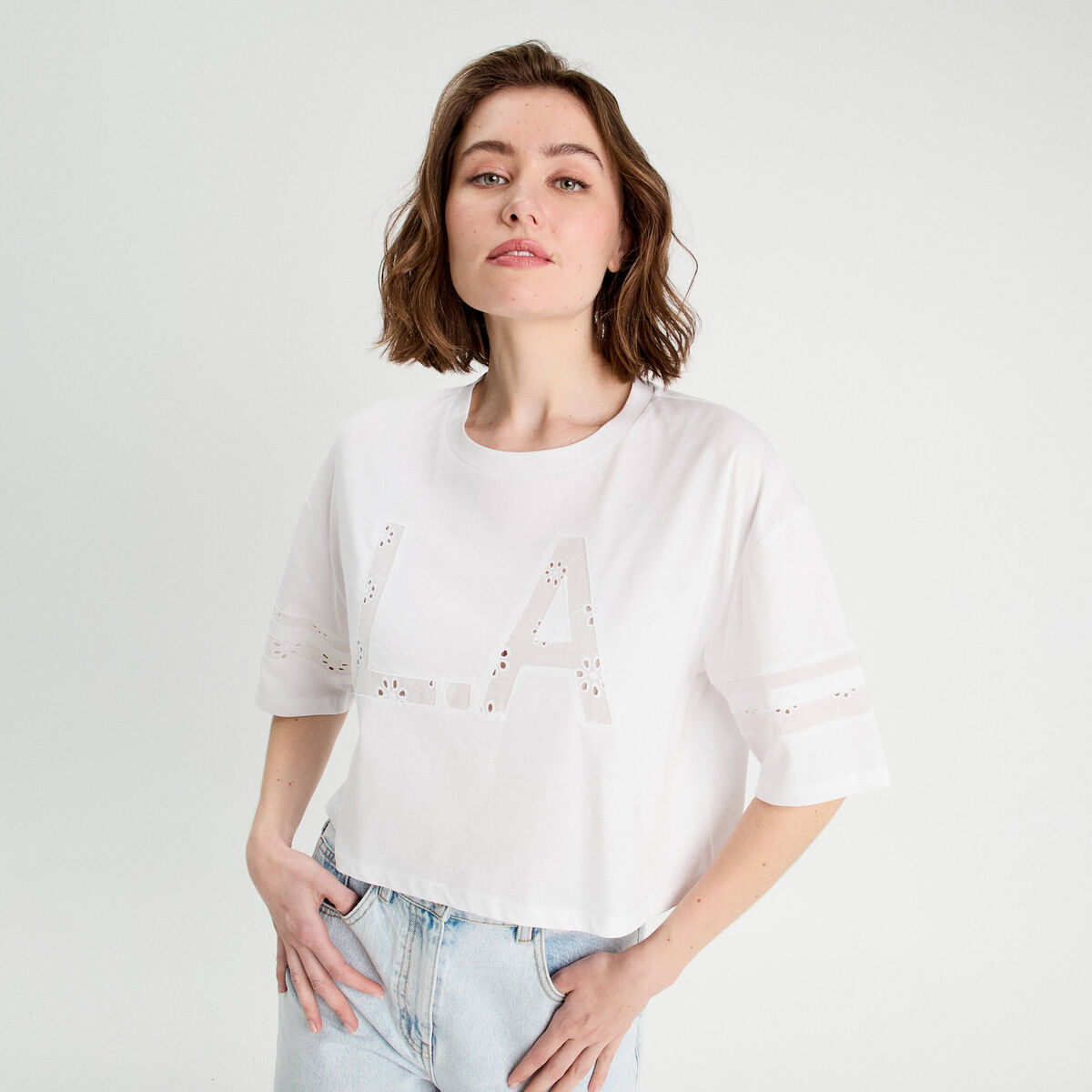 T-shirt cropped brodé blanc femme