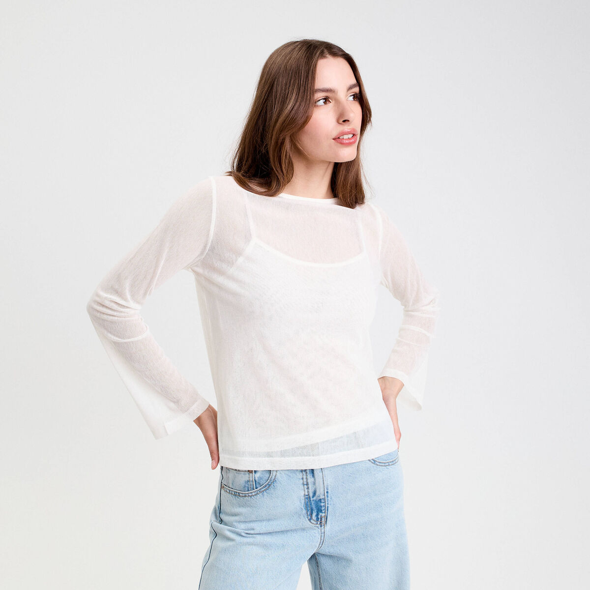 Top transparent col rond manches longues ecru femme