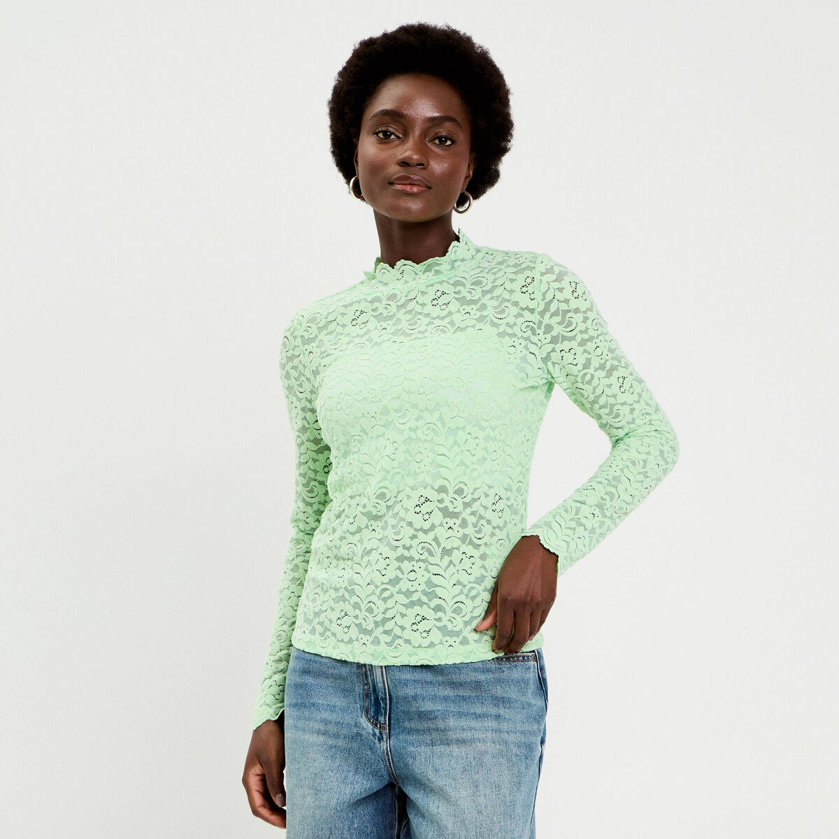 T-shirt dentelle manches longues vert pastel femme