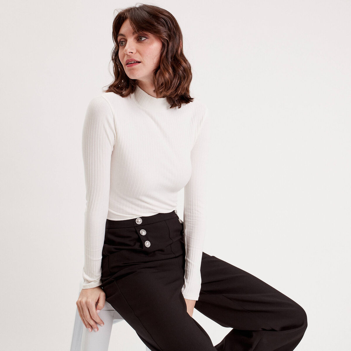 T-shirt côtelé col montant ecru femme