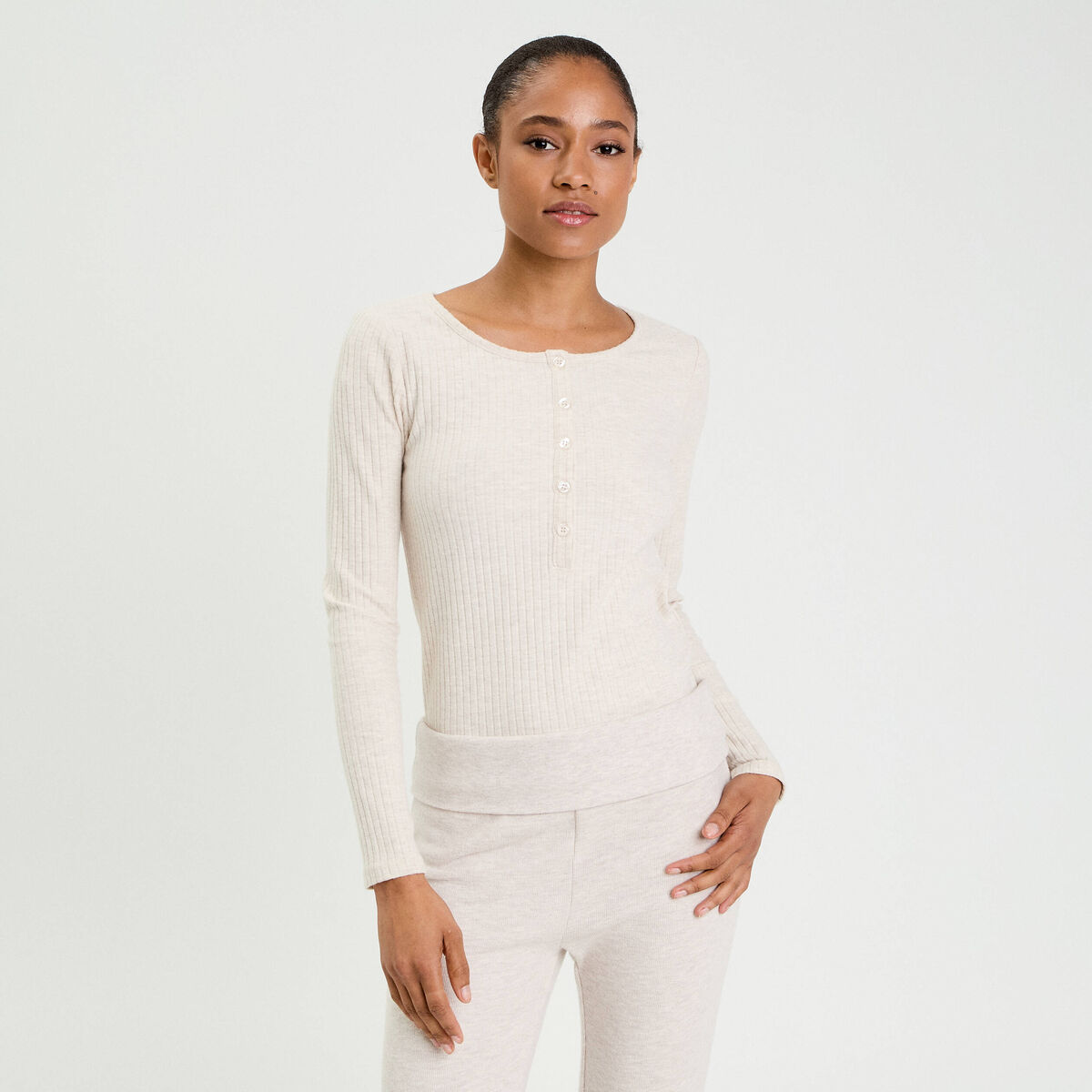T-shirt côtelé manches longues sable femme