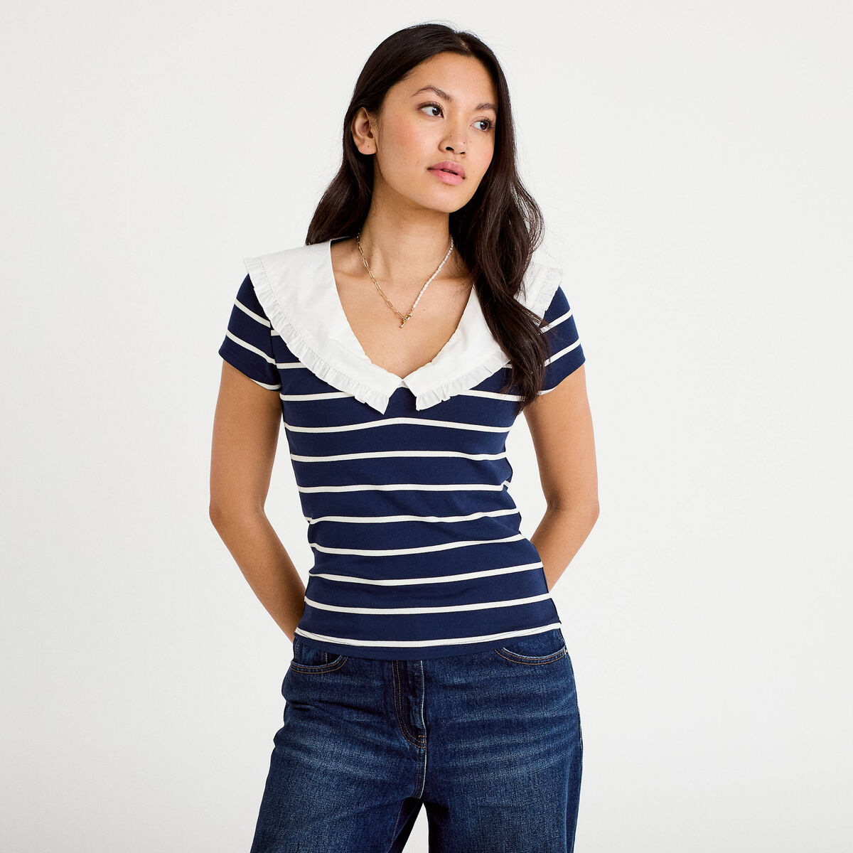 T-shirt col marin à volants ecru femme
