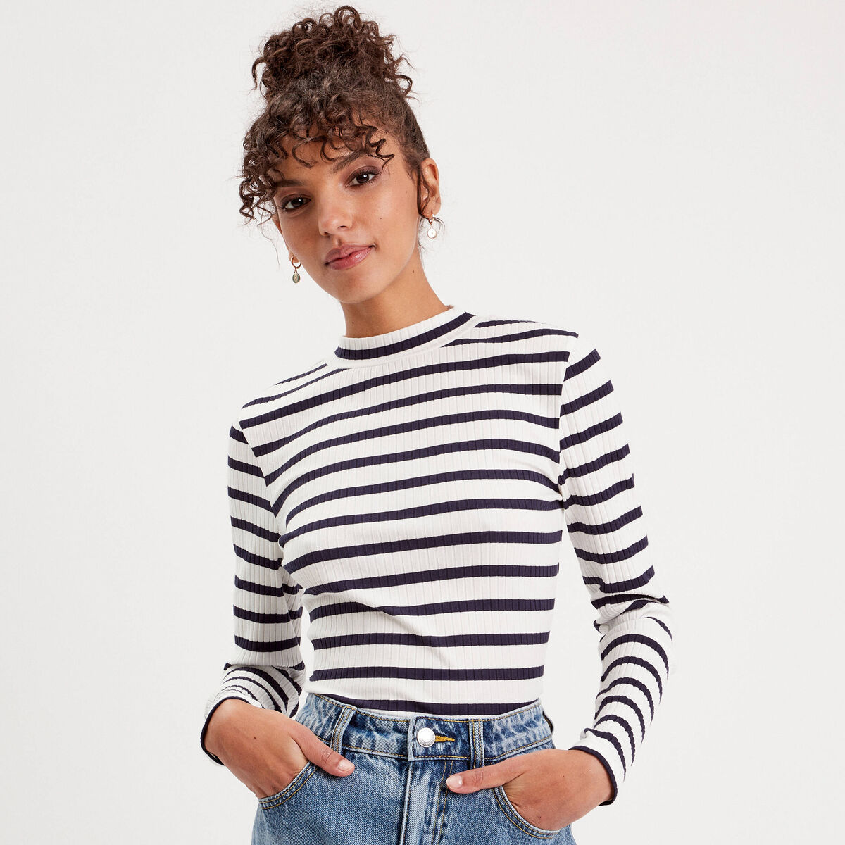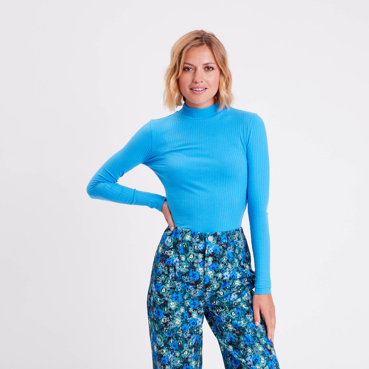 T-shirt côtelé col montant bleu femme