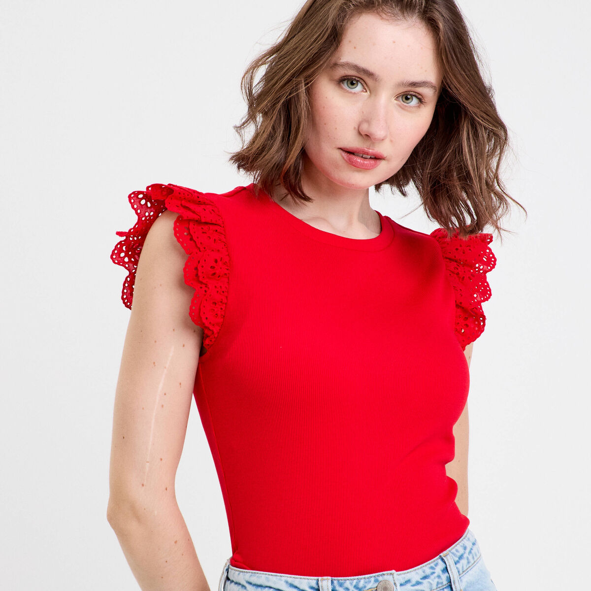 Débardeur volants brodés rouge femme