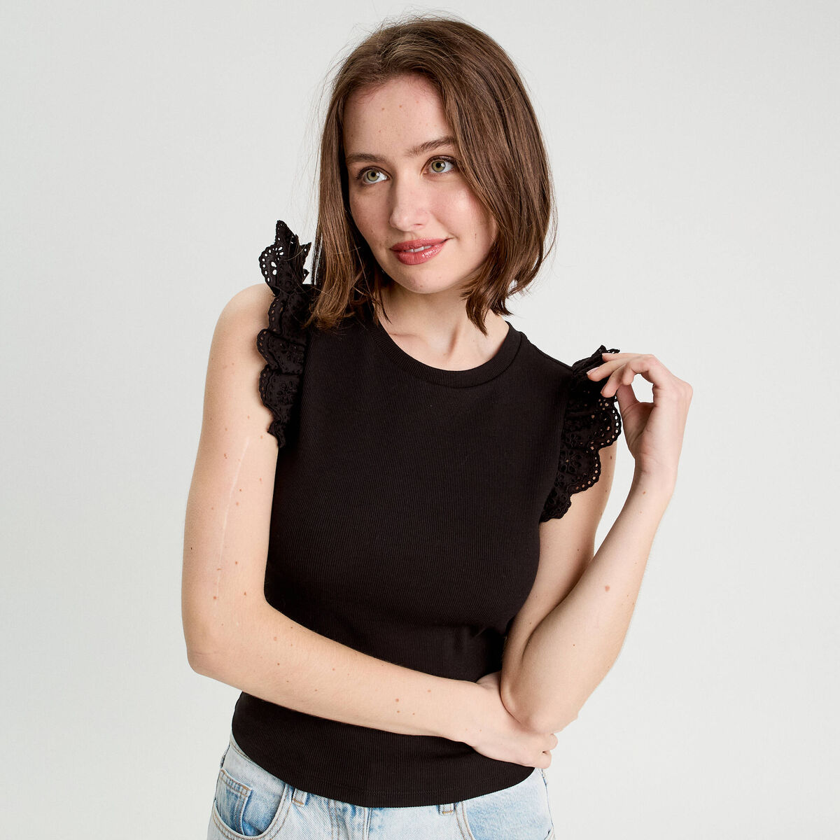 Débardeur volants brodés noir femme