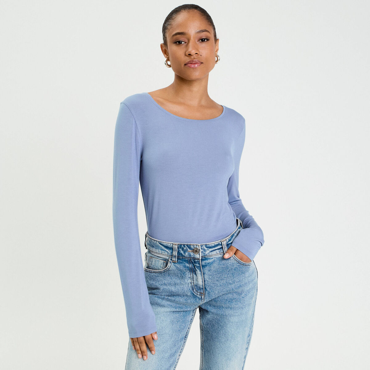 T-shirt uni à manches longues bleu gris femme